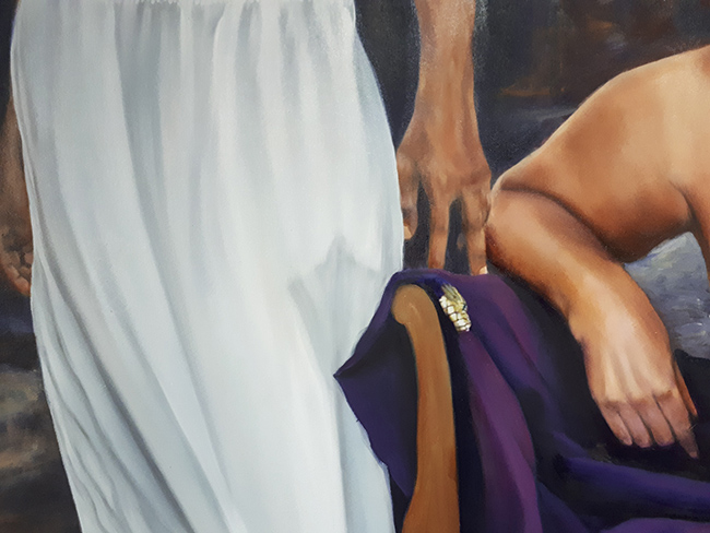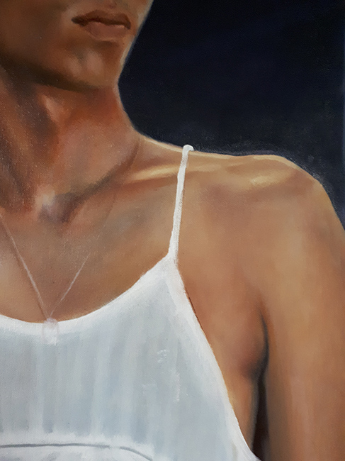 L’usage du portrait, figure majeure de l’art, revient de manière récurrente chez Stéphanie. Dans cette nouvelle série (en pied cette fois-ci), elle aborde la figure de l’artiste comme on se regarde dans un miroir. L’intérêt principal du portrait réside dans la représentation du visage, du regard. Puis ce sont les mains qui jouent de langage, la peau, la bouche. L’habit se fait parures, les étoffes et les draperies magnifient les sujets, renvoyant au deuxième plan le décor qui n’est plus que prétexte. Une composition travaillée dont l’objectif est d’attirer le spectateur dans un face à face. L’auteur nous rappelle qu’avant tout la peinture est un manifeste. C’est à partir de photographies prises avec l’accord et la complicité de ses modèles que Stéphanie Hoareau plonge dans le regard de ceux qui posent pour elle et fait de la peinture tout à la fois la preuve d’une réalité et celle de la création et de la liberté de manœuvre de l’artiste(2).