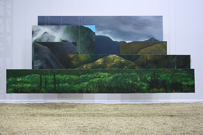 Stéphanie Hoareau, à l’instar d’Augustin Berque, pour qui le paysage ne se réduit pas aux données visuelles qui nous entoure [mais] est toujours spécifié de quelques manières par la subjectivité de l’observateur, donne à voir une réalité exaltée par son imaginaire qui trouve sa source dans les racines même de l’artiste. Stéphanie Hoareau est née à Paris en 1982. C’est en 2004 que cette jeune Réunionnaise d’origine renoue définitivement avec l’île qui a vu grandir sa famille. Ce nouveau point d’ancrage donne lieu à deux installations fragmentées du paysage (Bélouve et Welcome Salazie – 2010). La peinture s’impose et domine dans ces paysages qui se déroulent en grandes installations semblables à des décors de théâtre dans lesquels le spectateur s’immerge. A la manière des paysages irréels et romantiques d’Adolphe Le Roy, Stéphanie déplie sous nos yeux des morceaux de l’île tant imaginée dans son enfance, vision suspendue d’un territoire en équilibre entre réalités et fantasmes.