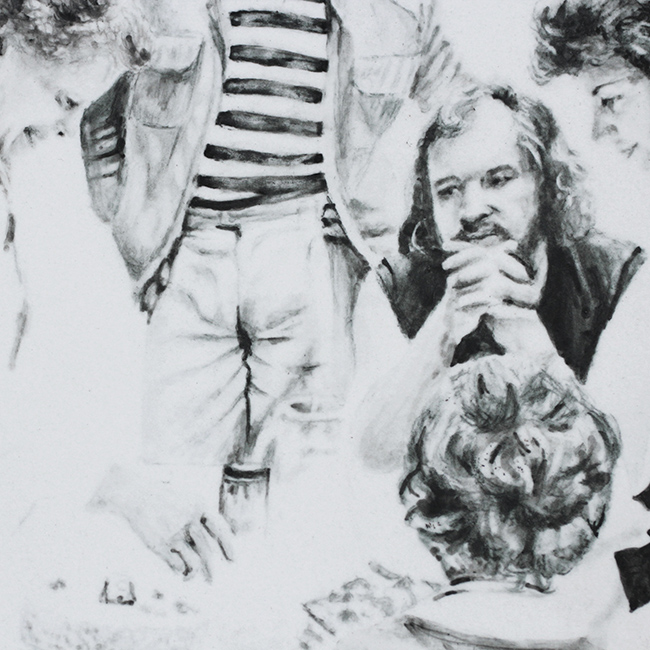 Si Stéphanie Hoareau contrebalance les discours simplistes et s’affranchit des codes éducatifs et culturels qui ont forgé sa vision du monde, c’est pour finalement nous emmener sur les traces de son passé, entre ici et là-bas, entre hier et aujourd’hui. Réactiver la mémoire pour évoquer les souvenirs et se confronter à sa propre image d’enfant, c’est un des enjeux qu’aborde la plasticienne dans ses derniers travaux. A partir d’un corpus de photos de famille, l’artiste REconstruit des scènes de la vie quotidienne ; repas du soir, pique-nique et partie de pêche. Les personnages semblent les mêmes, mais À bien y regarder… on découvre que chacun est enfermé dans son petit bout de vie ; des regards distanciés qui ne se croisent jamais soulèvent le paradoxe du vivre ensemble et des complexités de la relation. La frontière est mince entre la réalité des images et la fragilité du souvenir. Il y a chez Stéphanie Hoareau, une notion documentaire dans le traitement du dessin : finesse réaliste, usage du noir et blanc, décors quasi absents qui floutent nos repères et diluent le contexte. Cela peut être partout et n’importe où. L’œuvre se présente comme un territoire morcelé invitant le spectateur à cheminer d’une image à l’autre, au gré de ses propres souvenirs d’enfance. Les fines plaques de porcelaine aux scènes mémorielles ne sont pas sans nous rappeler « la belle vaisselle » délicatement ouvragée de nos grands-mères.