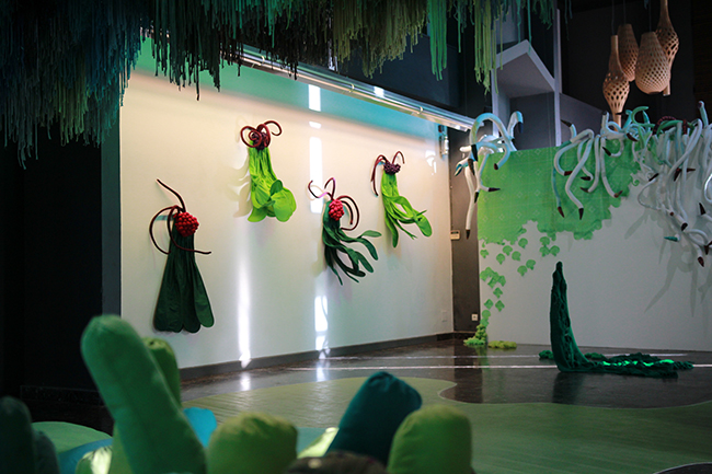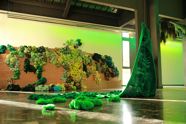 Les gestes vont s’amplifier dans le temps. Les sculptures qui tenaient au départ dans une main vont peu à peu se confronter à l’espace. Dans une stratégie de contamination organique, Tatiana Patchama transpose le monde végétal au moyen de matériaux textiles. À partir de graines collectées dans son jardin, elle réalise une série de dessins de formes cachées à l’intérieur des graines imaginaires (Totototal Off). Les dessins sont ensuite transposés en volumes mous et doux. L’artiste s’intéresse à la graine, ce tout petit élément végétal qui se déplace avec le vent, l’eau, les insectes ou les oiseaux. La graine devient une matrice qui va insuffler une dynamique à l’ensemble de son œuvre fondée sur une observation fine de la nature, de son fonctionnement, de ses formes, de ses cohabitations, de ses besoins. À partir de là, Tatiana Patchama va construire des paysages textiles explorant ce qu’elle nomme « la dimension malicieuse du Vivant. »[1] Elle s’inspire plus spécifiquement des adventices (en créole : les zoumines), les herbes folles plus communément appelées les « mauvaises herbes ». Malicieuses, têtues et résistantes, les adventices plantes poussent « là où on ne s’y attend jamais ». Si habituellement les humain.e.s s’obstinent à les domestiquer ou à les éradiquer, l’artiste nous invite à les laisser faire et à accompagner leur pousse. Du sol jusque dans les airs, les paysages textiles habitent l’espace d’exposition.