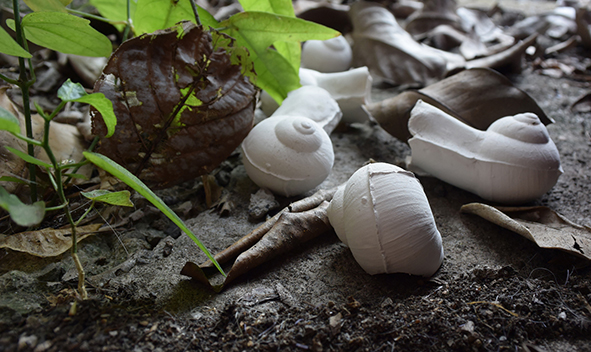 En 2018, l’Observatoire des tortues marines – Kelonia, invite Tatiana Patchama à réaliser une œuvre proposant une réflexion sur la présence massive des matériaux plastiques dans les mers et les océans. Pendant six mois, elle travaille cette fois à partir de milliers de bouteilles en plastiques récoltées. L’œuvre est pénible à fabriquer : physiquement et éthiquement. Au fil des gestes pluriels l’amenant à défaire les objets, l’artiste prend conscience des propriétés et de la portée des matériaux plastiques. La réalisation de l’œuvre a renforcé de profondes convictions écologiques. Elle réfléchit aujourd’hui à nos besoins, à une forme de décroissance quant aux productions humaines, à l’impact de ses choix sur l’environnement. Elle pose la question de l’action : comment agir ? Comment produire sans détruire ? Comment restituer de l’espace du Vivant ? Inspirée par les discours d’Hubert Reeves ou de Gilles Clément, elle consacre dans son atelier un espace important au jardin pour penser davantage à la cohabitation entre les espèces. Dans ce lieu végétal, Tatiana Patchama collabore avec celles et ceux qu’elle appelle les « ouvrier.e.s de l’ombre » : les insectes, les arbres, les oiseaux, les margouillats, le vent, la pluie, la chaleur. Elle réalise des sculptures à partir de feuillages, pratique des techniques de couture sur du papier, pense à une dématérialisation complète de l’œuvre par la création sonore. Elle souhaite revenir vers des techniques ancestrales en travaillant le fil, la terre ou les pigments. « Je me demande à quoi ressembleraient nos jardins sans escargots. Ou encore, ce que serait le monde si le silence venait à remplacer le chant des oiseaux. » De par ses questionnements, ses inquiétudes et ses engagements, Tatiana Patchama adopte aujourd’hui une pensée écoféministe : « La cause des femmes est celle de l’écologie et de la métamorphose d’un monde économique en une société antiéconomique ; cette cause est celle de l’espère humaine tout entière, et non seulement de son avenir meilleur : de sa possibilité d’avoir encore un avenir. »[3]