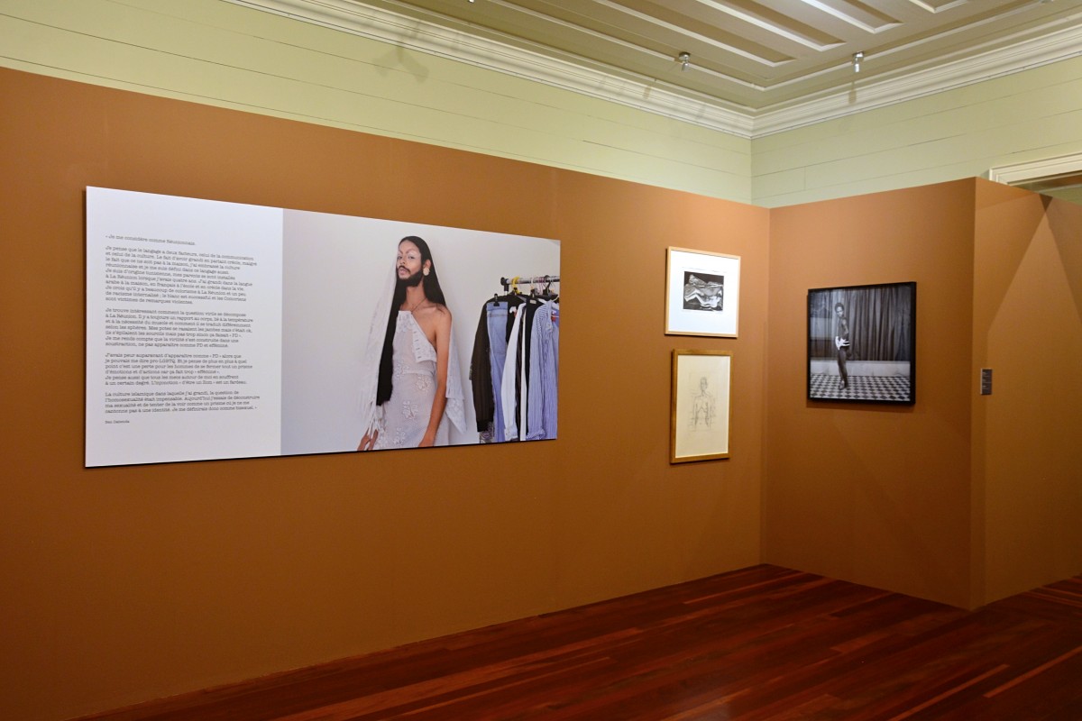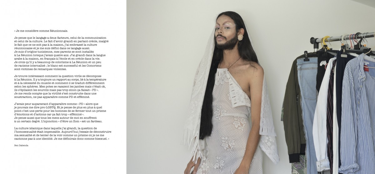 Brandon Gercara est un·e artiste et militant·e activiste au sein du mouvement Kwir sur l’île de La Réunion. La série Conversations permet un archivage de la parole d’individus issus des différentes minorités sexuelles. Ce projet inclusif propose de mettre face à face un texte qui reprend un témoignage et la photographie de ladite personne sous des artifices drag. Ces attributs nouveaux permettent à la fois l’anonymisation du modèle mais également une émancipation certaine. Faire sur-exister ce que tant ont tenté d’invisibiliser. Revanche et protection, le déguisement demeure l’instrument de ceux qui se jouent de l’œil du regardant pour mieux exister.