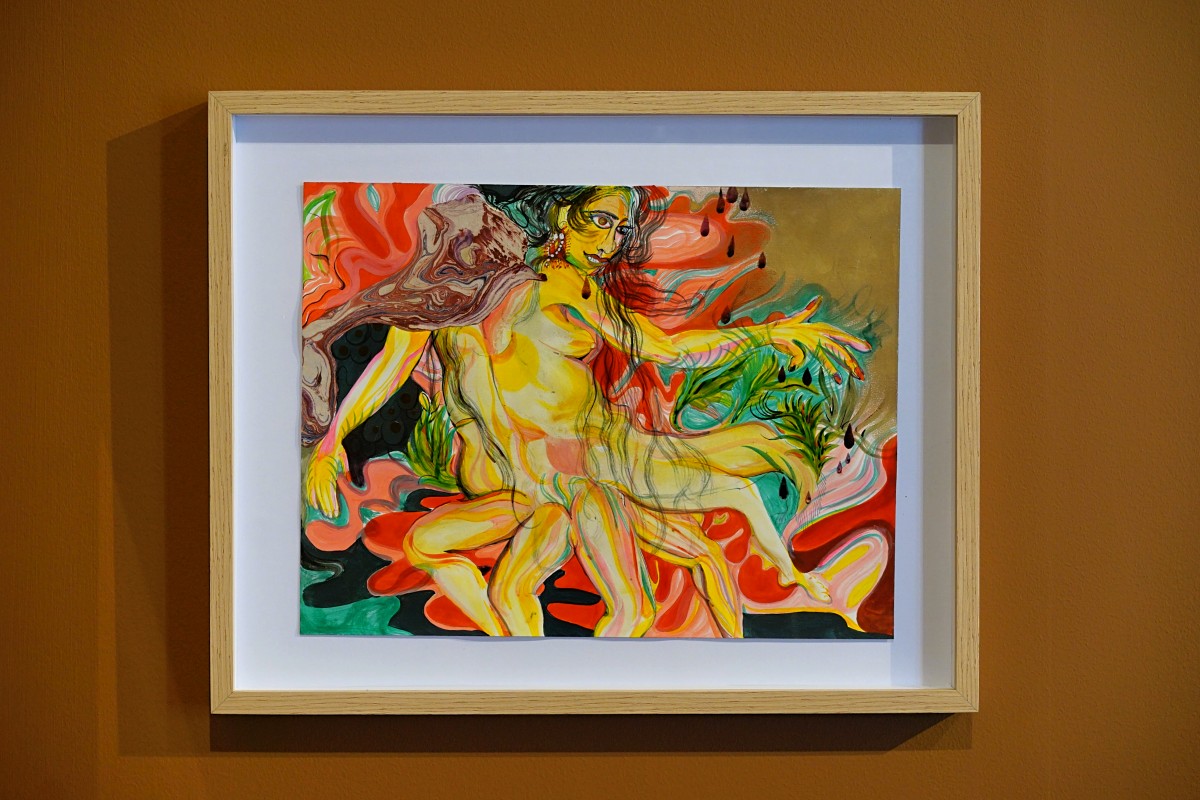 Shine Shivan, artiste indien vivant entre Kochi et Faridabad, déploie des corps qui dansent, auréolés, enrubannés, « bijoutés », coiffés, peut-être un peu canailles. Nus. Une nudité joyeuse. Même lorsque les couleurs sont sombres, les lumières orange auréolent le discours posé par l’artiste qui rejette la catégorisation genrée des corps.