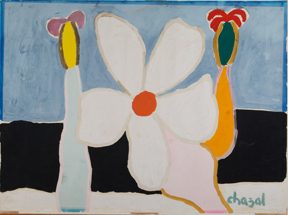 Les fleurs et autres poissons fétiches aux couleurs vives habitent ses toiles, soit un monde de formes sorties tout droit du cahier de dessin de l’enfance[3], ce qui lui vaudra l’étiquette de peintre naïf. Or pour cerner la peinture de Chazal, il faut regarder au-delà des images et percevoir ses toiles et autres gouaches sur papier comme des espaces agissant, des formes phénoménologiques. Son œuvre plastique ne décrit pas le monde, il tisse son rapport au monde. Généralement réalisées sur papier, les gouaches sont figuratives mais elles ne figurent pas seulement des maisons, des fleurs ou des oiseaux, ce qu’on pourrait appeler à tort des paysages ou des natures mortes, elles communiquent tout au contraire la vitalité du monde. Ses « barbouillages », comme il les nomme lui-même, sont donc des exaltations du vivant. La fleur_ qu’on retrouve au centre de la composition Une fleur- deux palmiers, fond bleu et noir_ est un leitmotiv dans son œuvre depuis qu’il entra en émoi devant une azalée du jardin botanique de Curepipe qui semblait le regarder. De cette rencontre est née Sens-Plastique, le livre qui le propulse au rang d’auteur de génie et qui pose sa théorie des sens infinis, un principe de volupté, un dialogue perpétuel des formes dans le monde. « L’amitié de la fleur » fut alors au cœur de sa mythologie personnelle, tout comme le langage des oiseaux et celui de la pierre. Pour Chazal, « la nature nous parle mais nous sommes aveugles et sourds », ainsi le partage du monde végétal et animal est inconcevable. Dans sa littérature comme dans sa peinture, la hiérarchie ou classification des êtres est rejetée au profit d’une réciprocité de l’homme et la nature. On comprend alors que ses peintures qui ne présentent jamais de figure humaine sont pourtant l’incarnation de la relation de l’homme à son environnement.