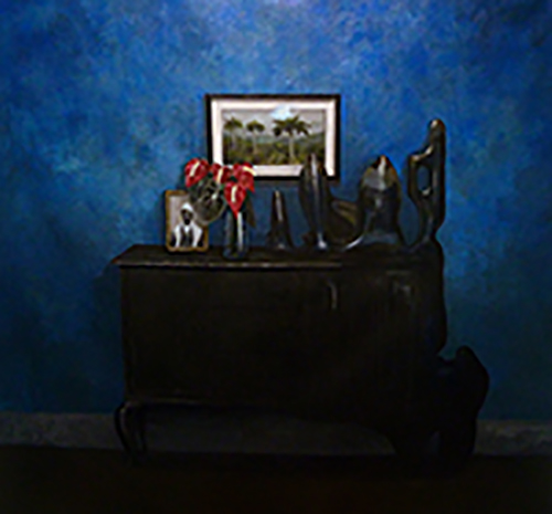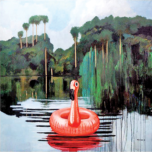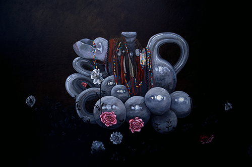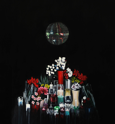 Jimmy Cadet revisite un genre traditionnel de l’histoire de la peinture : la nature morte. Il s’empare des éléments de la vie intime et domestique pour dresser un portrait ambivalent de la société réunionnaise. En ce sens, il travaille la dimension critique et politique d’un genre artistique habituellement affilié, selon les mots de Matisse, au luxe, au calme et à la volupté. La société réunionnaise y est perçue de l’intérieur. Les natures mortes sont composées de fleurs, de bouteilles en plastique, de cannettes de sodas, de boîtes de médicaments, de crânes d’animaux, de bougies, de bidons ou encore de vaisselle en porcelaine raffinée. Il fait dialoguer des éléments élégants et bourgeois, avec d’autres motifs nous envoyant à différentes formes d’addictions et à un mal-être sous-jacent. Deux réalités sociales cohabitent au sein d’un même espace, d’une même composition. Cette promiscuité engendre des tensions accentuées par d’autres éléments perturbateurs et intrusifs. Sous les natures mortes apparaît une autre réalité : des nappes déchirées, des amas de peintures qui interfèrent avec les éléments sophistiqués, des coulures, des tubes, des projections et des agrégats de câbles électriques. On observe également des départs d’incendie ou des explosions de matières sombres. Cette vie souterraine indique une menace imminente, une défaillance et une profonde inquiétude. Jimmy Cadet porte un constat critique sur l’avenir d’une société aux fondations fragiles. Une société sous perfusion, alimentée par des câbles précaires et bricolés, qui menace d’imploser à tout instant. Sous la fine couche du vivre ensemble idéalisé gronde les injustices et les failles d’un système caduc.